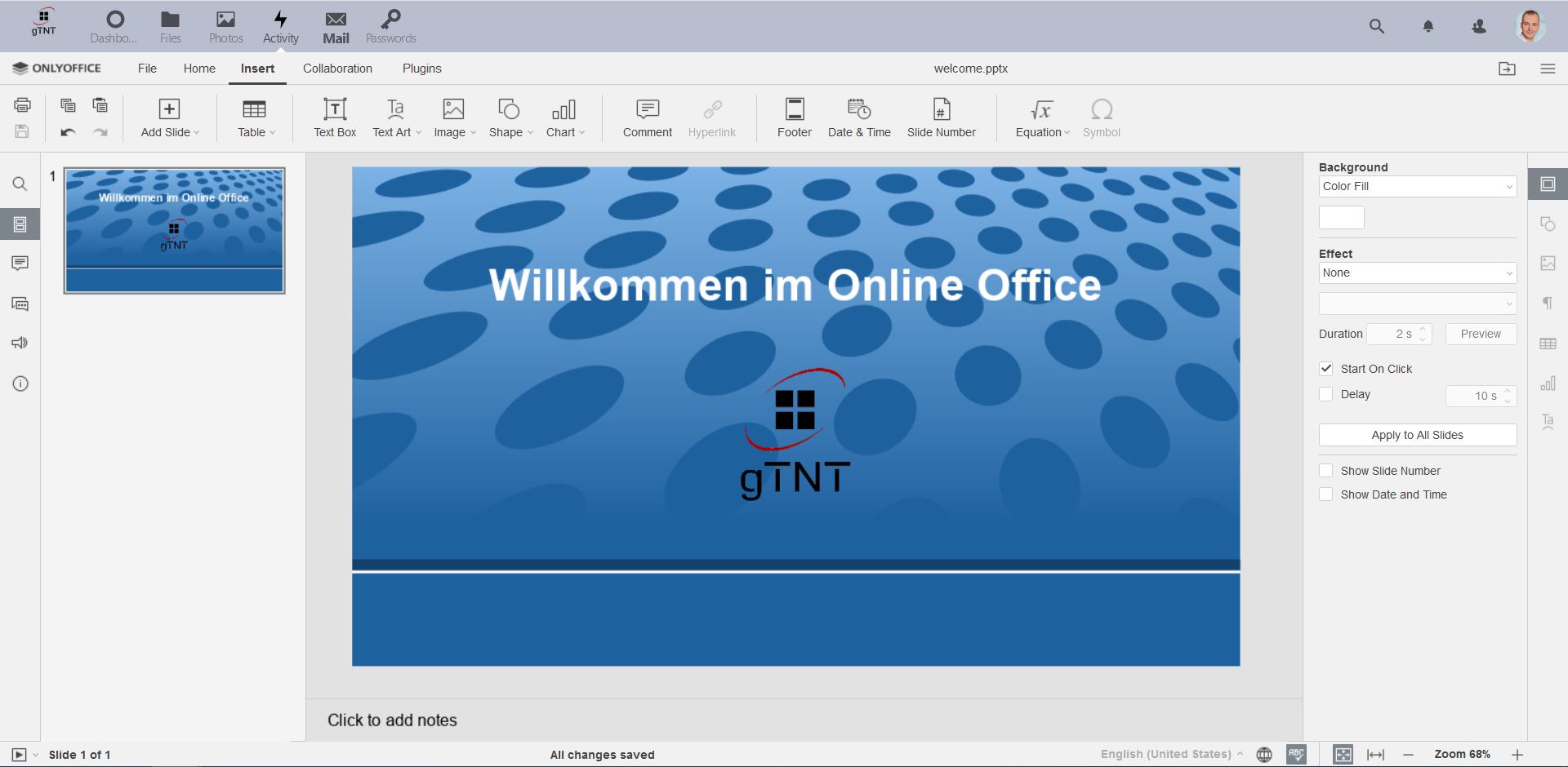 Geastalten Sie Ihre Cloud individuell, damit Ihre Geschäftspartner gleich bei der Startseite erkennen können, dass Sie sich auf Ihrer Onlinepräsenz befinden. Sie haben die freie Wahl über die Domain (soweit noch verfügbar, z.B. my-company.com), die Anpassung des Themes an Ihre Firmenfarbe, sowie die Verwendung Ihres Firmenlogos (nachdem Sie dieses an uns übermittelt haben).