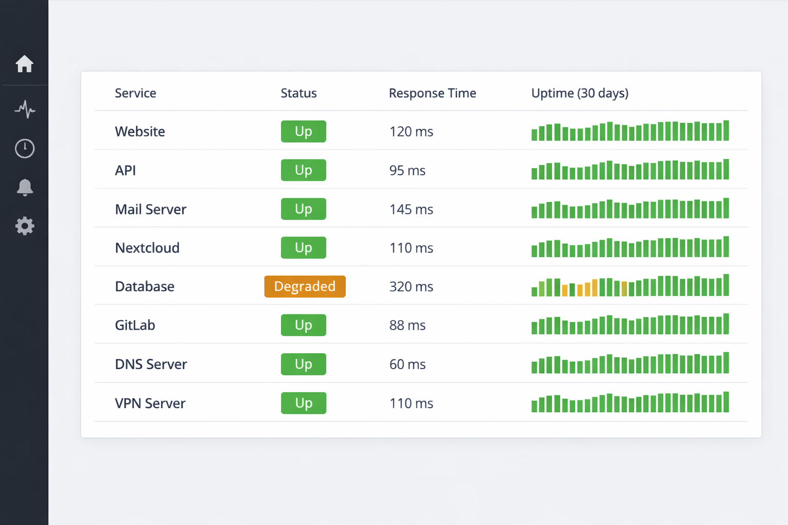 Every hosted service is monitored around the clock with Uptime Kuma. Instant alerts when something goes down, response time tracking, and public status pages your customers can trust.